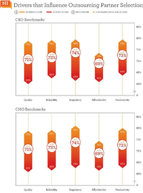 Two attributes tend to rise to the top of almost any list of desired attributes in an outsourcing partner — quality and reliability. Since Nice Insight’s first survey, these two have maintained the top two rankings, and we expect them to continue to carry the most weight among sponsors assessing contract service providers. Benchmarks for quality and reliability — for both CROs and CMOs — increased from 2011 to 2012 by 1% and 3% respectively, which suggests that CROs and CMOs are making an effort to improve in these areas, and this is being recognized by the buyers.