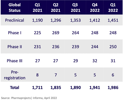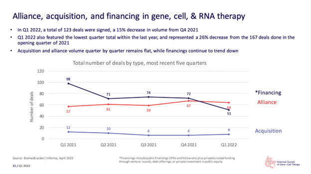 “Q1 2022 saw the lowest quarter total of deals signed within the last year, representing a 26% decrease from Q1 2021. Alliance volume remained flat and financings trended down. Start-up financing dropped to $507.8 million, while the number of companies raising seed or Series A financing stayed at 15. Overall, however, the gene, cell, and RNA therapy landscape continues to expand. The gene therapy pipeline has increased 16% since Q1 2021. In the pipeline, there are 3,579 gene, cell, and RNA therapies in development from preclinical through pre-registration stages.”