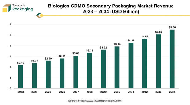 In February, a report was released projecting the biologics CDMO secondary packaging market could rise from $2.59 billion this year to USD $5.50 billion by 2034. That’s an annual growth rate of 8.75%.