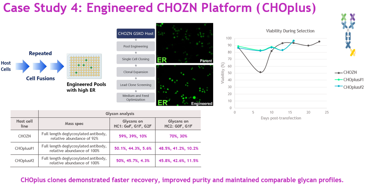 To further boost capacity, we partnered with CHOplus to engineer a CHOZN host with enhanced ER capacity. After multiple rounds of genome engineering and cloning, two CHOplus clones were selected and integrated into our HTP workflow (Figure 8).