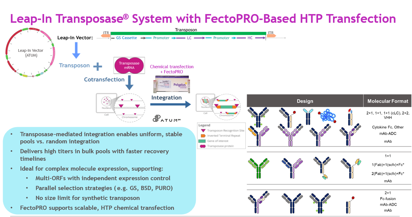 The introduction of Leap-In transposase technology provided an opportunity to transform CLD efficiency. Unlike random integration, Leap-In supports multiple site-specific integrations, producing highly stable pools in shorter timelines (Figure 2). By pairing this with integrated automation (Lynx, NyOne, Octet, Zephyr, VIPS, Ambr15) and optimized selection strategies, we created a true end-to-end HTP platform.