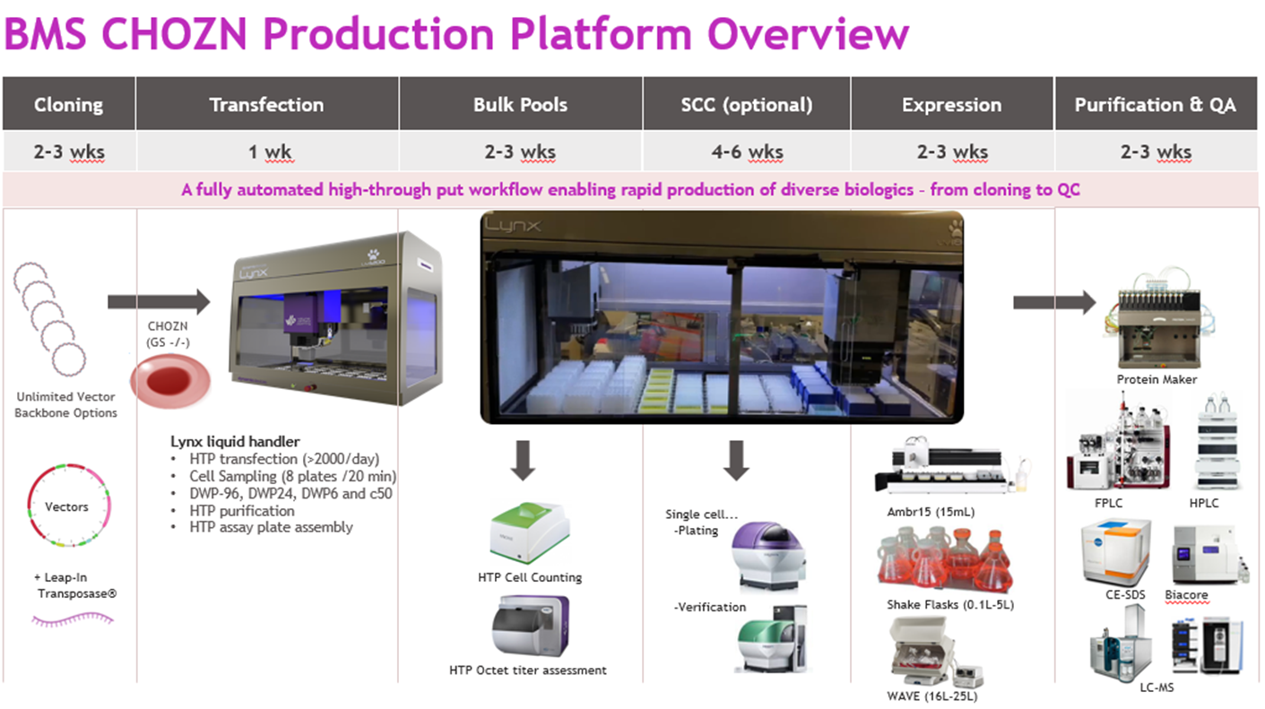 Historically, the CHOZN platform has been the basis for stable biologics expression at BMS. While robust and well characterized, it involves a sequential and labor-intensive process — often taking over three months from DNA to large-scale material. For high-throughput discovery programs, this creates major bottlenecks, especially when producing large antibody panels or screening multiple bispecific formats.