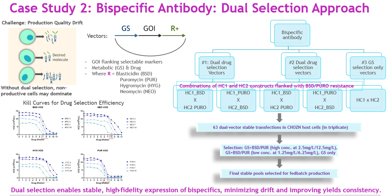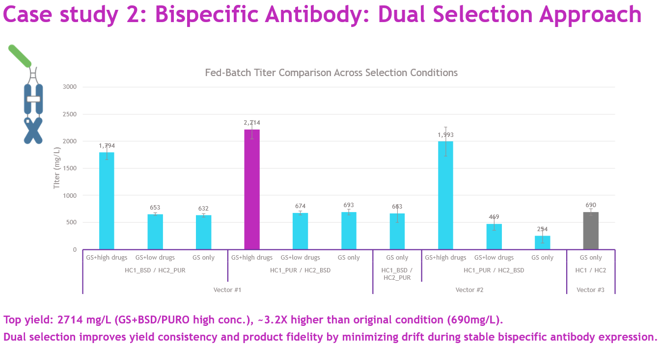 Bispecific antibodies often suffer from production drift, where non-productive clones dominate during selection, lowering yield and product fidelity. We developed a dual-antibiotic selection strategy to address this (Figure 5).