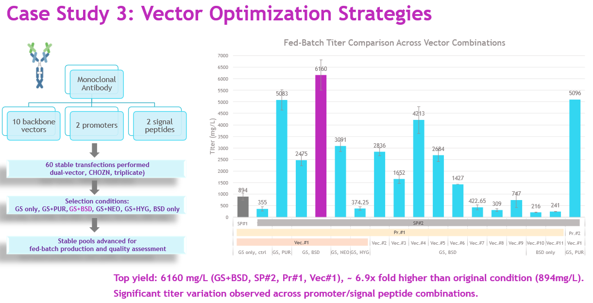 For a challenging mAb program, we screened 10 backbone vectors, two promoters, and two signal peptides, evaluating 60 stable transfections under six different selection conditions (GS, GS+Puro, GS+BSD, GS+Neo, GS+Hyg, BSD only) (Figure 7).