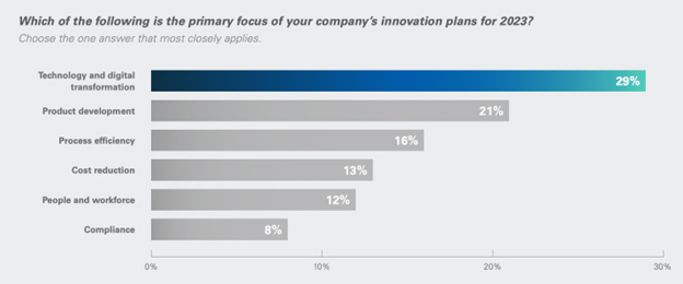 “When asked to identify the single top area of focus for innovation plans in 2023, 29% of respondents selected technology and digital transformation ahead of product development, process efficiency, cost reduction, people and workforce, and compliance … digital transformation could deliver process efficiencies, which may result in reduced costs.”