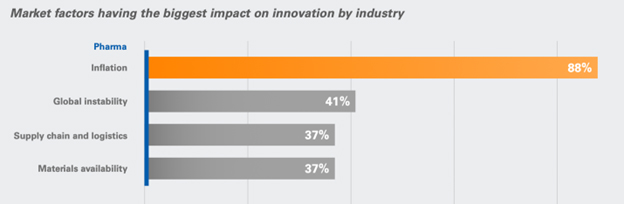 - Higher costs for inputs (raw materials, equipment/facility upgrades, energy, skilled workers) sharpens the focus on maintaining or increasing current revenue streams, enacting cost reductions, and the upholding of profitability – not the furthering of funding R&D.