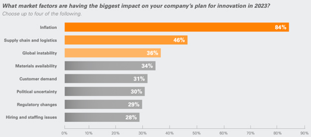 “C-level executives universally cite one major factor impacting their innovation plans in 2023: inflation,” says the 2023 State of Revenue Report, from Model N, which focuses on high-tech, pharma and med-device executives.