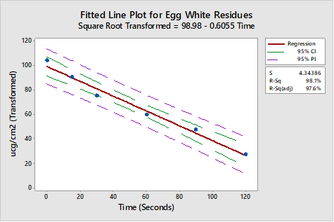 The R-Sq (adj) of 97.4 percent and visual examination both revealed a better fit for the data. While the quadratic model is a better fit and demonstrates that there is curvature in the data, it is not an appropriate model for extrapolating estimated cleaning times. So, to correct for the curvature, these egg white residue data were transformed using a square root transformation and again plotted and evaluated against a linear model (Figure 5).
