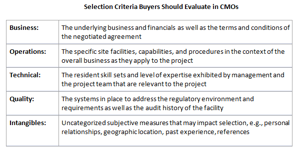 Categorizing criteria helps focus discussions and guide evaluations. Unsurprisingly, this is a two-way street. In similar ways and for reasons described above, CMOs also screen and qualify companies that approach them with inquiries, i.e., you too will be evaluated against predetermined criteria, such as those that follow.