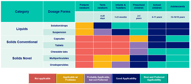 Fig. 3 — Pediatric population dosage form acceptability matrix. Source: “Formulations of choice for the paediatric population,” EMEA/CHMP/PEG/194810/2005.
