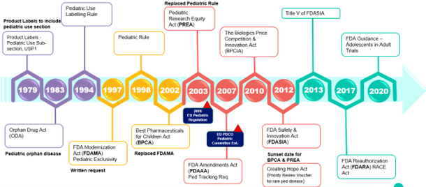 Fig. 1 — Timeline of US and EU regulations impacting pediatric therapies