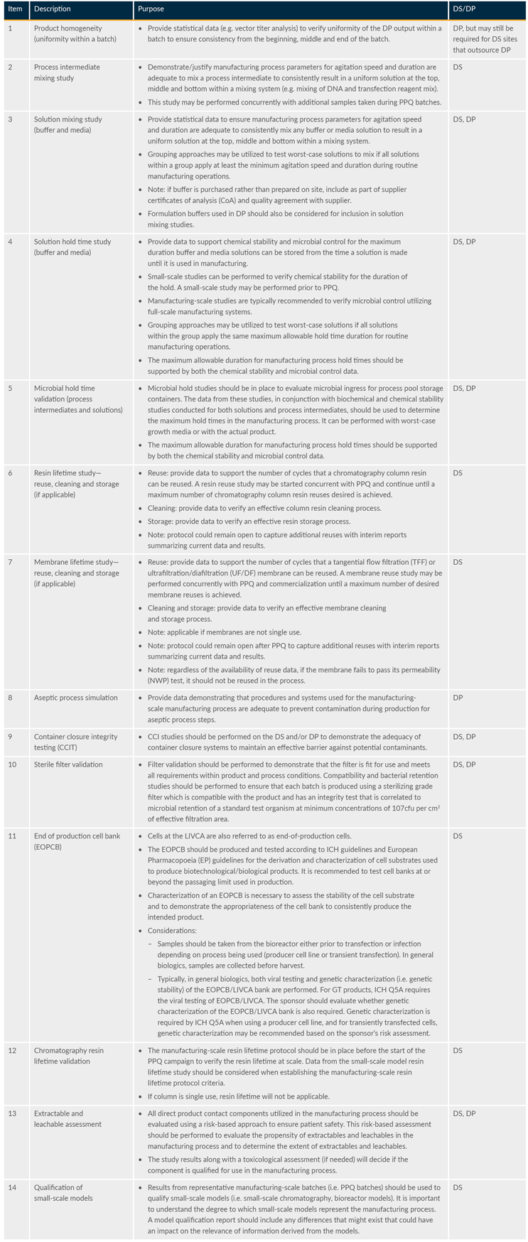 Table 2: PPQ-supportive studies that are required as part of the overall validation package (extract)