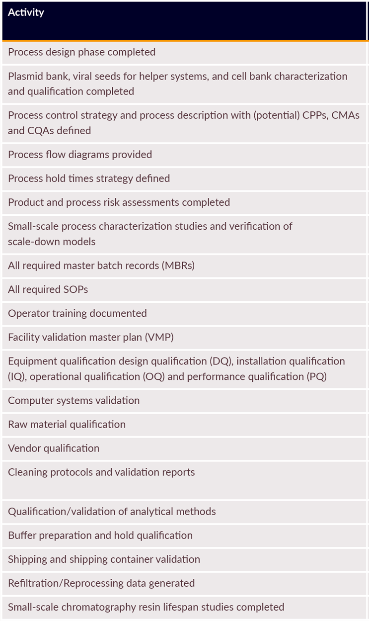 In addition, identified potential CPPs and CMAs should be reviewed and approved by quality before protocol execution. A process failure mode and effect analysis approach for some aspects of plasmid processes may be applicable with appropriate documentation and risk assessment. It is also important to define roles and responsibilities before PPQ execution. Table 1 provides an example of prerequisite activities for PPQ.