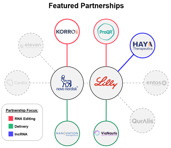 Another interesting partnership is Korro Bio’s alliance with Novo Nordisk. Korro Bio is also developing RNA editing strategies and therapeutics. This is an area that has seen recent positive data clinically for the first time from Wave Life Sciences. As one of several companies focused on RNA editing, Korro Bio’s work with Novo Nordisk could spur new advancements, expanding the RNA space into an entirely new modality with the promise of reversible gene modulation. Additionally, ProQR’s preexisting partnership with Eli Lilly has a similar focus and could help further unlock RNA editing.