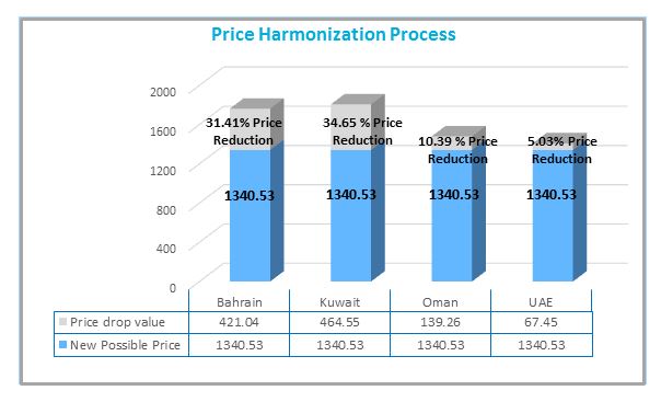 The Price Harmonization Process would create a re-alignment of prices in Bahrain, Kuwait, Oman and UAE to the price in Saudi Arabia, the lowest of the basket. The projected reductions are shown below in Figure 1