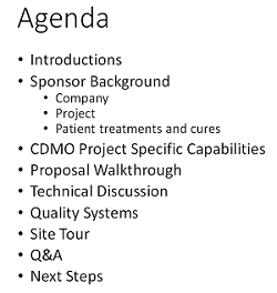 I discourage presenting lengthy corporate slide decks or data-intensive research expositions during the visit. Each side’s presentation should provide appropriate background and context for the visit. Prepare no more than three to four slides, and circulate them prior to the meeting. CDMOs often feel disconnected from the patients they will ultimately impact — you can close this gap by including a high-level clinical overview of the disease and information about product requirements in your presentation. If the drug product has innovative attributes, bring samples to show the CDMO’s team.
