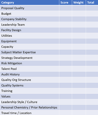 Additionally, review the selection criteria as a team prior to the audit, and then decide if the priorities and weightings are still valid — or need to be updated based on new information and/or changing circumstances. Scan public information for company announcements from the CDMO or news or events (e.g., FDA audits) that need to be addressed. It is not unheard of for a CDMO to radically change direction, get acquired, or even be shut down by the FDA during a selection process.
