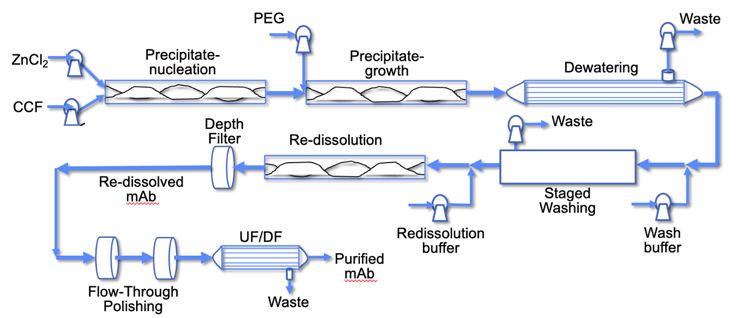 Although precipitation is often thought of as a batch process, mAb precipitation can be readily implemented in a continuous format using simple tubular precipitation reactors employing static mixers inside of appropriately sized plastic tubing. The static mixers provide relatively narrow residence time distributions, leading to a very uniform microenvironment that is needed to achieve the desired product quality and process control. The ZnCl2 and PEG can be added sequentially using tubular precipitation reactors in series to optimize the nucleation and growth phases to obtain the desired precipitate morphology.