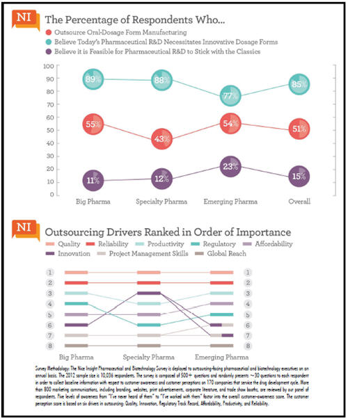 With diverging drivers for outsourcing, it is perhaps no surprise that they have varying preferred CMOs for oral solid-dose manufacturing. However, Next Pharma and Catalent both appear in the top three in two buyer categories. Big Pharma’s descending order of preferred CMOs are Boehringer Ingelheim, Next Pharma, and AMRI. Specialty Pharma respondents identified Wellspring, Catalent, and AbbVie (formerly Abbott Contract Manufacturing) in the top spots. The top three among emerging pharma respondents are Catalent, Glatt, and Next Pharma.