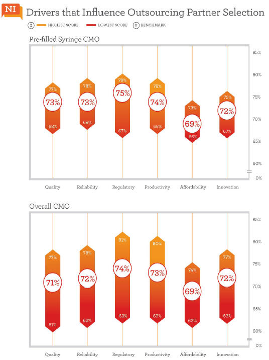 Innovation often holds sixth place among the outsourcing drivers when ranked by survey respondents, but when viewed from the perspective of CMO performance perceptions, it was ranked one place higher—in fifth. With an average score of 72% among CMOs that offer prefilled syringes, the innovation score was the same as the broader CMO benchmark (72%). The prefilled syringe subset also averaged the same score for affordability as the mainstream CMO benchmark, each at 69%. Affordability tends to be the lowest scoring category regardless of groupings (CMOs, CROs, and service or technology related subsets), which should not come as a surprise since drug innovators are consistently facing cost pressures and the overarching goal of reducing drug development expense.