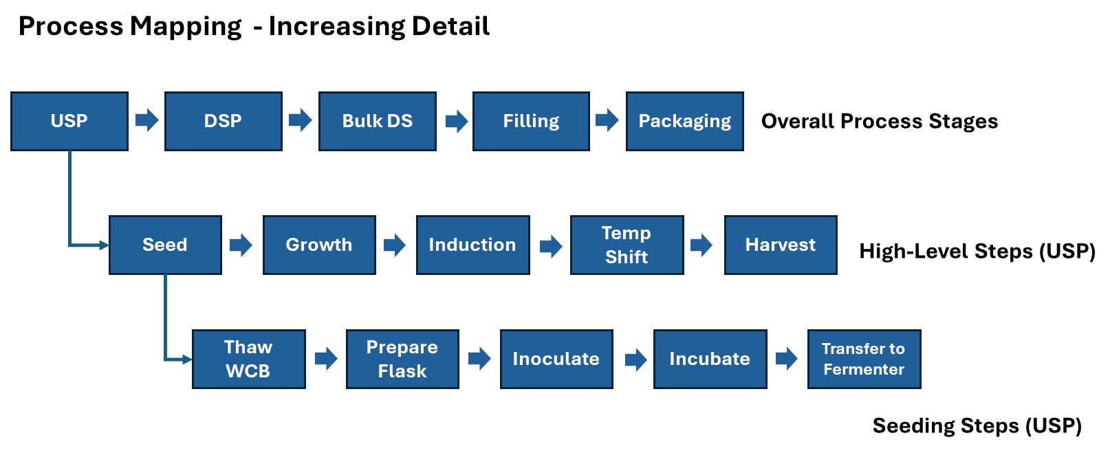 Normally, one must go three levels deep into sub-steps to identify significant process knowledge, or its absence. Figure 3 above shows an overall process map for a typical bioprocess from upstream to packaging and then a two-level “drill-down” into part of the upstream process.