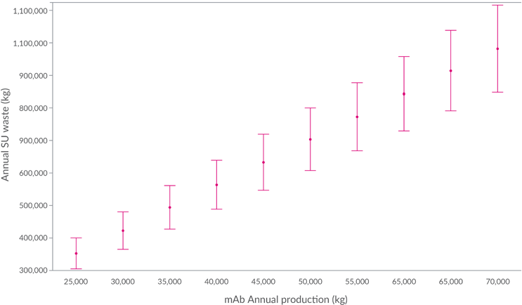 Figure 8: Estimated annual single-use plastic waste based on the corresponding annual mAb demand