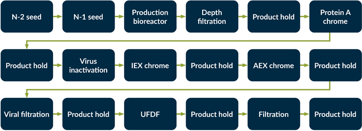 To quantify plastic usage associated with a typical commercial-scale mAb manufacturing process, a detailed process model has been developed. See Figure 2 for an outline of the process flow.