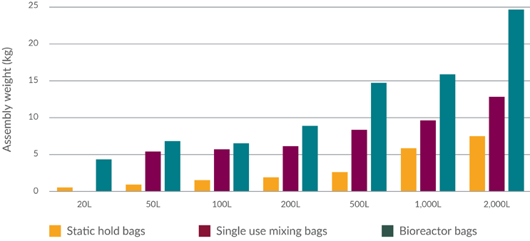 - Assembly weights based on single-use product data from suppliers and end users have been considered (see Figure 4), provided by single-use component suppliers and manufacturing companies. Assembly weights include packaging, which accounts for 30%-40% of the stated weight.