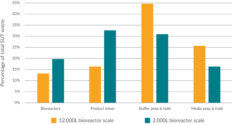 While absolute quantities of plastic waste in large-scale manufacturing are lower, they remain substantial with SUT being used for seed bioreactors, smaller-scale media, and buffer preparation and hold.