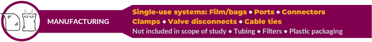 - Single-use assemblies associated with single-use bioreactors, single-use product mixers, and single-use buffer/media preparation and hold systems (which represent a high proportion of regular plastic waste) have been included within the scope of this study. The model does not consider ancillary plastic-containing items, such as single-use filters, single-use tubing, chromatography resins, etc. Therefore, the output is not a total quantification of all solid waste generated by the manufacturing process.
