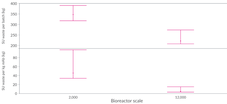 Figure 5: Single-use plastic waste on a per batch (top)/kilogram mAb basis (bottom) for 2,000 L and 12,000 L manufacturing scale (weighted mean considering all variables with 95% confidence interval)