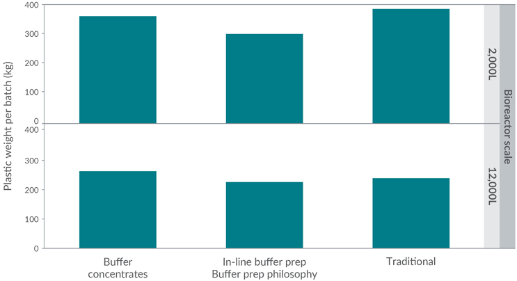 The use of advanced buffer management strategies (such as buffer concentrates and in-line buffer preparation) may increase plastic waste associated with buffer at a large scale and decrease it at an intermediate scale. However, in all scenarios, the quantity of waste associated with buffer remains substantial.