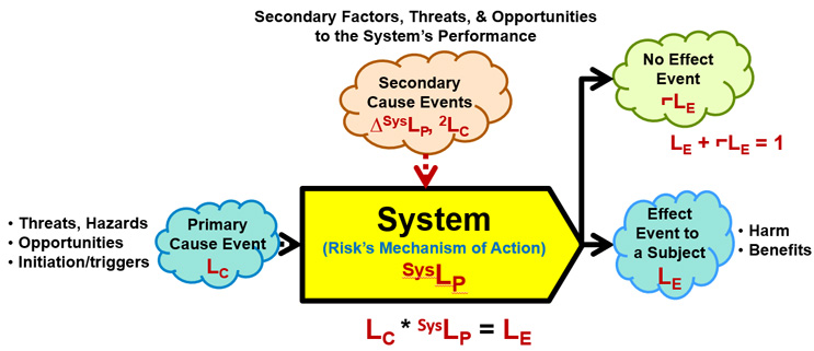 - System – The risk's mechanism of action that includes any intended or actual actions or activities by which the initiating cause event is propagated to produce the effect event or consequence. The system can include any combination of people, equipment, activities, plans, or sequences of actions. The probability of the system propagating the cause is described as SysLP.
