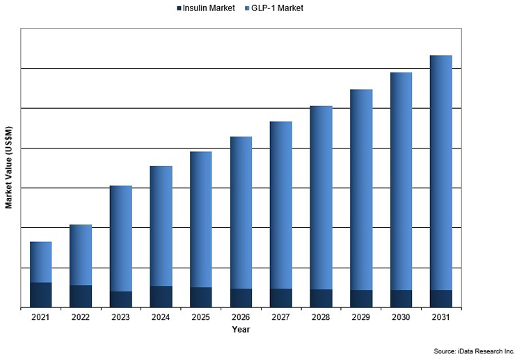Figure 2: Diabetes Drug Market Overview by Segment, 2021–2031. Access iData Research for more.