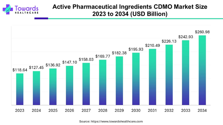 Steady, elongated growth, says the chart above, which comes from a recent Towards Healthcare report titled: Active Pharmaceutical Ingredients CDMO Market Size & Trends in CDMO Partnerships.