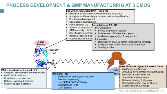 For example, here’s what he tells us about the services he outsources for Calibr’s bispecific small molecule antibody conjugate (SMAC), targeting prostate cancer, that is based on a “unique ADC-type structure optimization enabled by unnatural amino acid technology”: