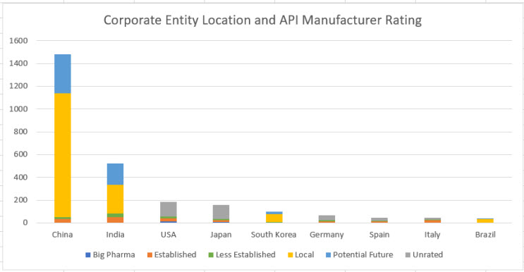 The largest category is the “local” supplier type based in China – this category alone accounts for 41% of all API manufacturers. While China, undoubtedly, pursues its own strategic goals with development of its API industry, it can only do it as a result of Western desire to acquire the lowest cost drugs while keeping a polluting industry as far away from home as possible.